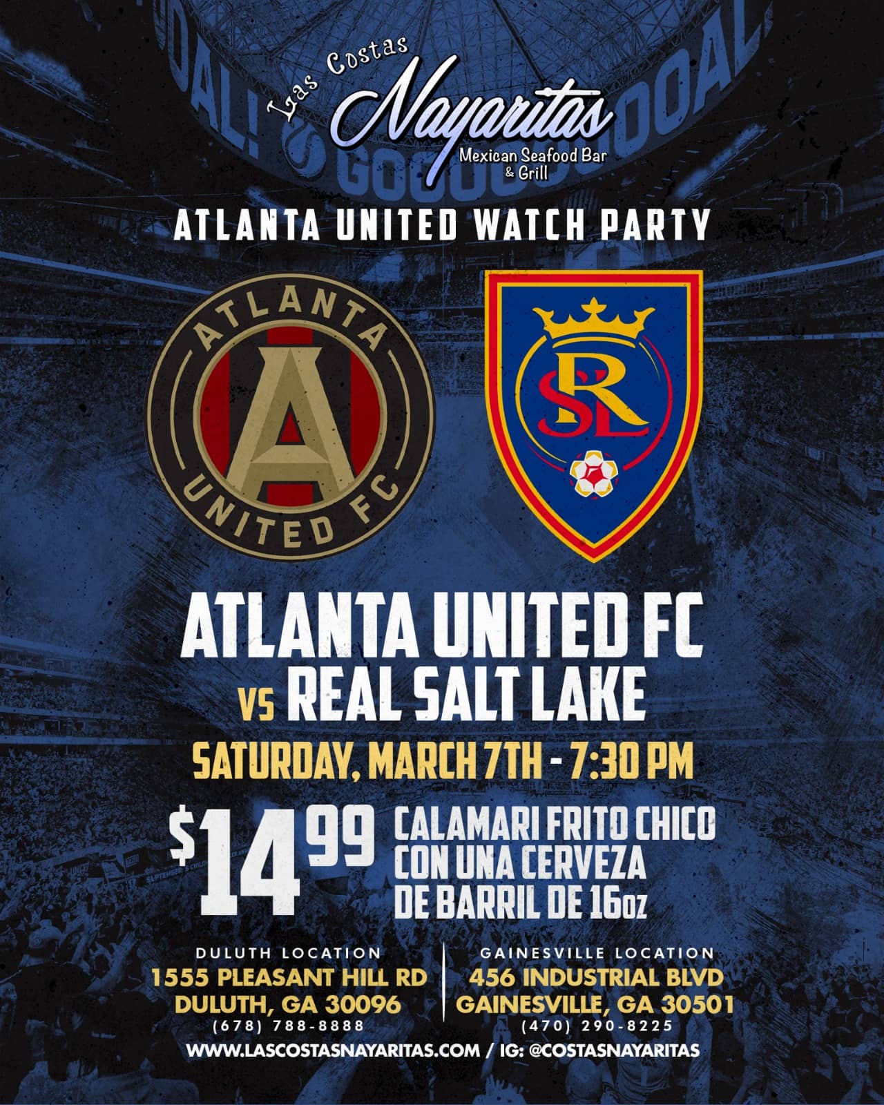 ⚽🔥 Atlanta United Watch Party at Las Costas Nayaritas! Join us Saturday, March 7th at 7:30PM as Atlanta United takes on Real Salt Lake—game on, mariscos ready, and the vibes on point in Duluth & Gainesville! 🙌 Enjoy our special: $14.99 Calamari Frito Chico + una cerveza de barril de 16oz 🍺🦑 Bring your crew, rock your jersey, and let’s cheer loud, eat fresh, and celebrate fútbol Costas style! #AtlantaUnited #WatchParty #LasCostasNayaritas