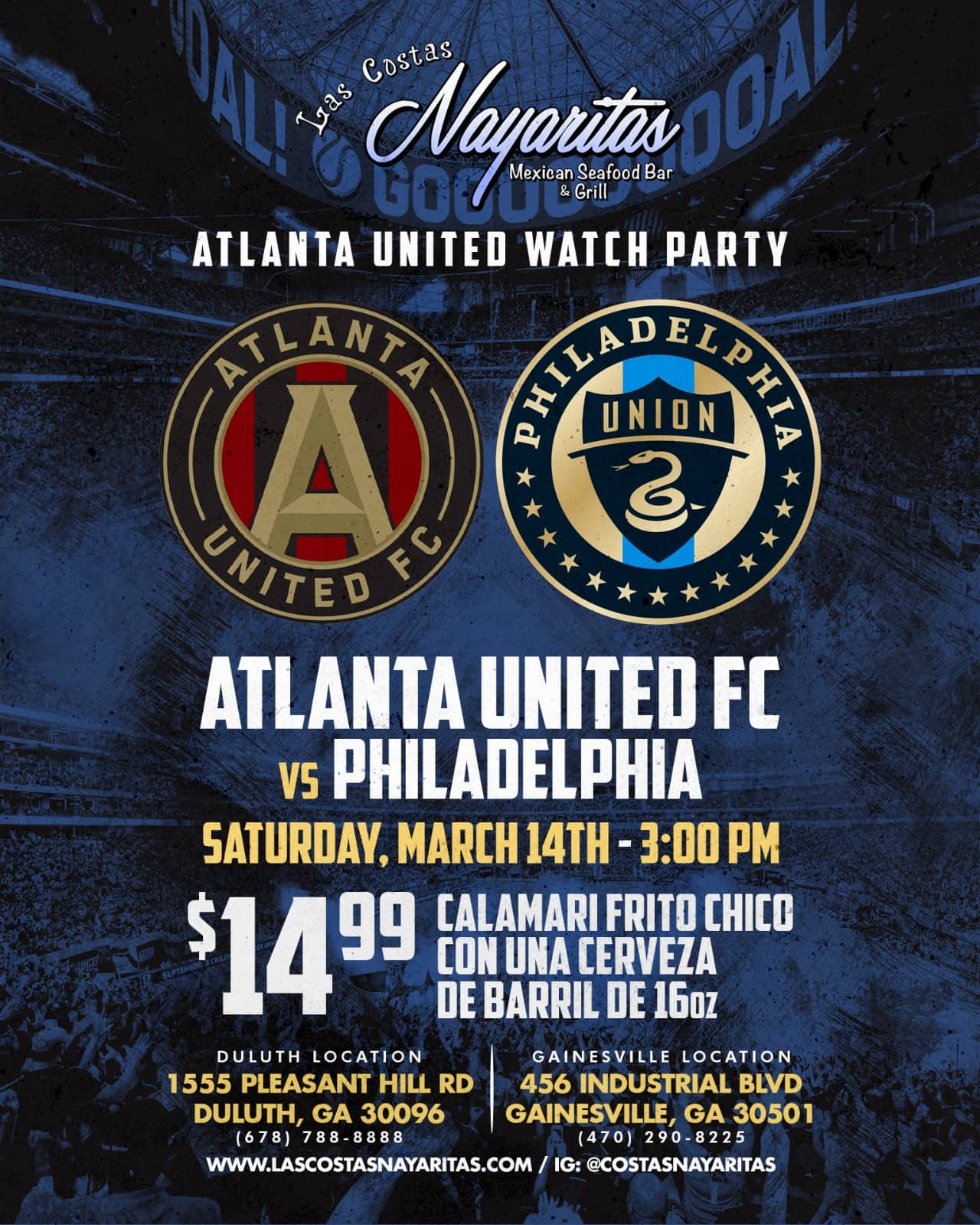 ⚽🔥 It’s MATCH DAY vibes at Las Costas Nayaritas! Join us Saturday, March 14th at 3:00PM as Atlanta United takes on Philadelphia Union—fútbol, mariscos, and cold cervezas all in one place in Duluth & Gainesville! 🙌 Don’t miss our special: $14.99 Calamari Frito Chico + una cerveza de barril de 16oz 🦑🍺 Pull up with your jersey, bring the crew, and let’s cheer loud y comer sabroso Costas style! #AtlantaUnited #WatchParty #LasCostasNayaritas