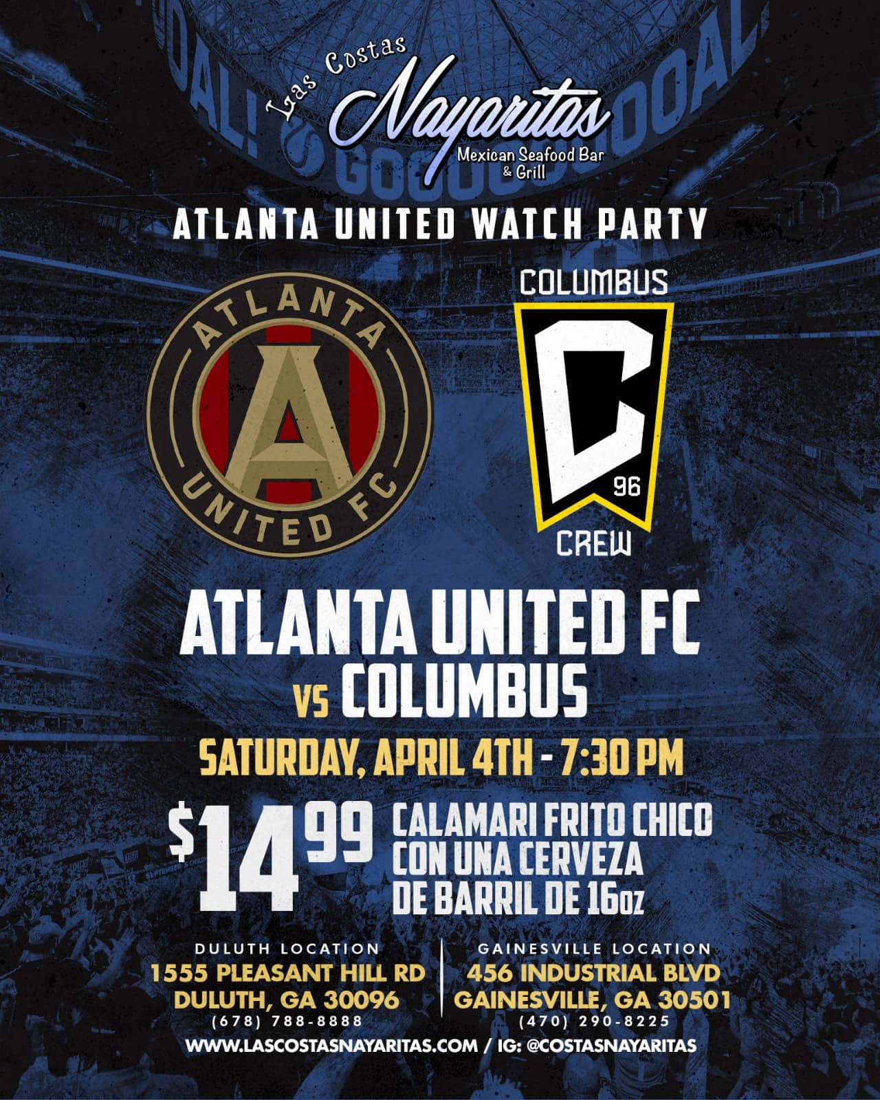 ⚽🔥 Get ready for another Atlanta United Watch Party at Las Costas Nayaritas! Join us Saturday, April 4th at 7:30PM as Atlanta United takes on Columbus Crew—big screens, loud vibes, and the best mariscos in Duluth & Gainesville! 🙌 Don’t miss our game day special: $14.99 Calamari Frito Chico + una cerveza de barril de 16oz 🦑🍺 Pull up with your crew, rep your jersey, and let’s celebrate fútbol y sabor Costas style! #AtlantaUnited #WatchParty #LasCostasNayaritas