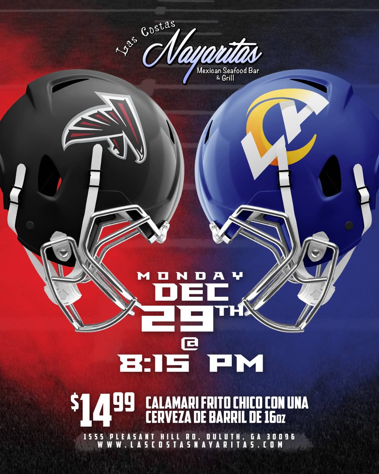 The Falcons close out December under the lights against the Los Angeles Rams this Monday, December 29th at 8:15 PM! Catch the primetime action with friends and enjoy our special: $14.99 Calamari Frito Chico with a 16oz Draft Beer.